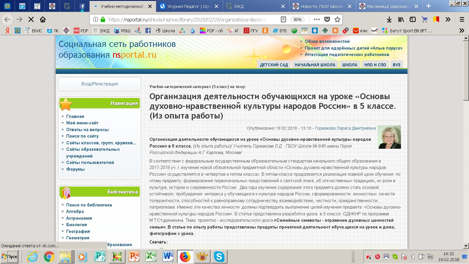 Организация деятельности обучающихся на уроке «Основы духовно-нравственной культуры народов России» в 5 классе. 18.02.2018