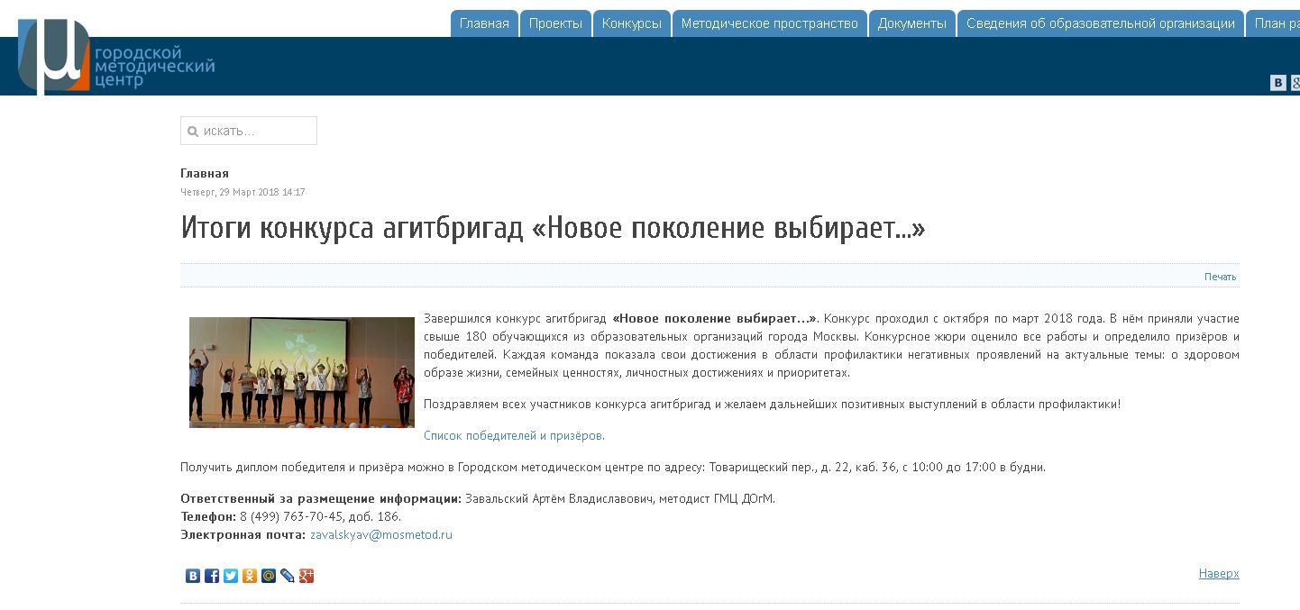 Статья на портале ГМЦ "Итоги конкурса агитбригад «Новое поколение выбирает…» 01.04.2018